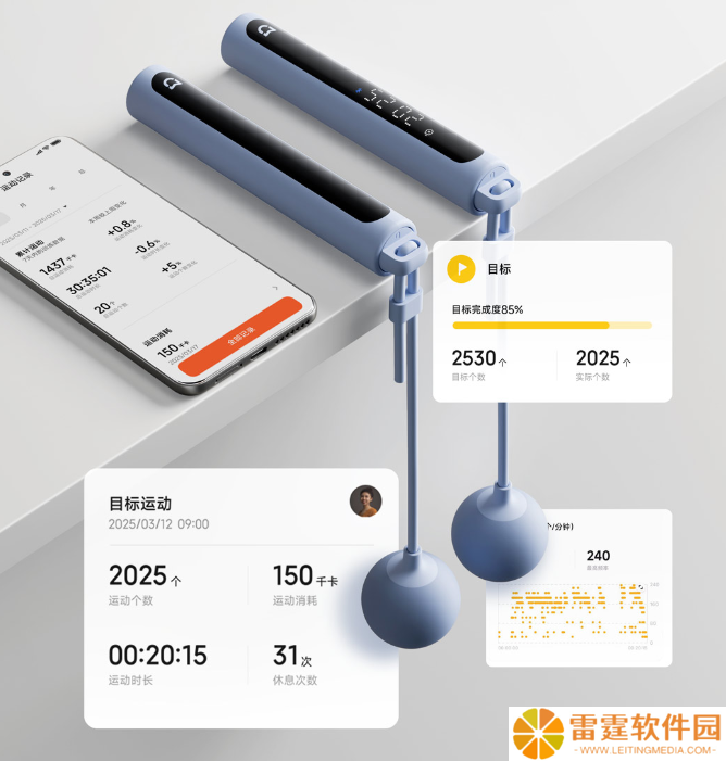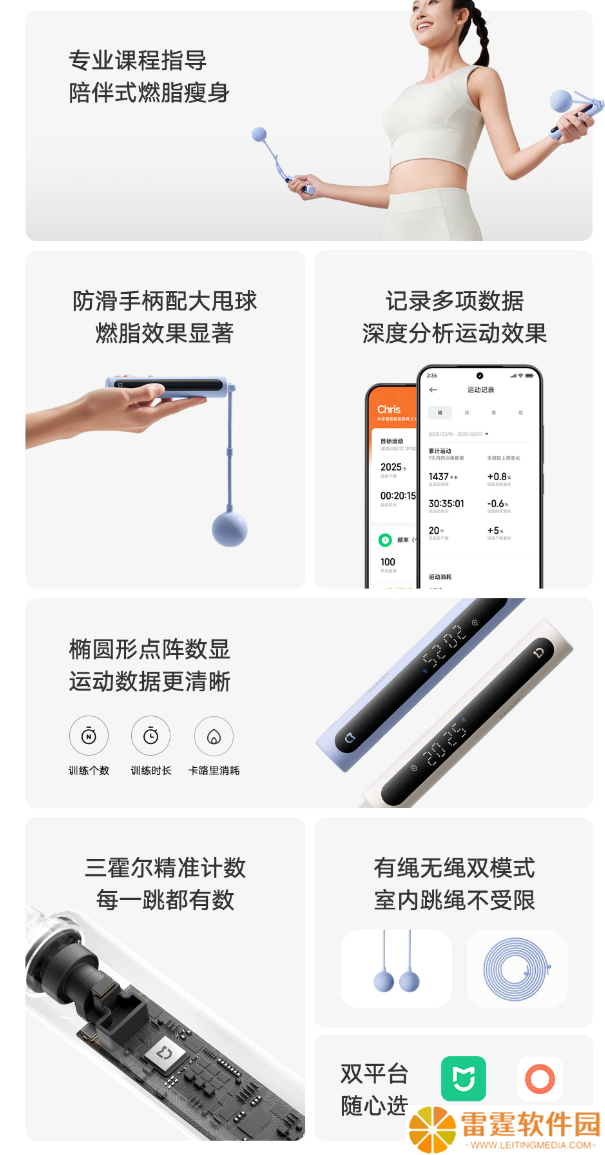 新品配备三组高精度霍尔传感器,结合自研过滤算法,不多计、不漏计,精准统计每一次有效跳绳。点阵数显屏幕结合椭圆形深色跑道设计,可查看跳绳个数、训练时长、卡路里消耗。